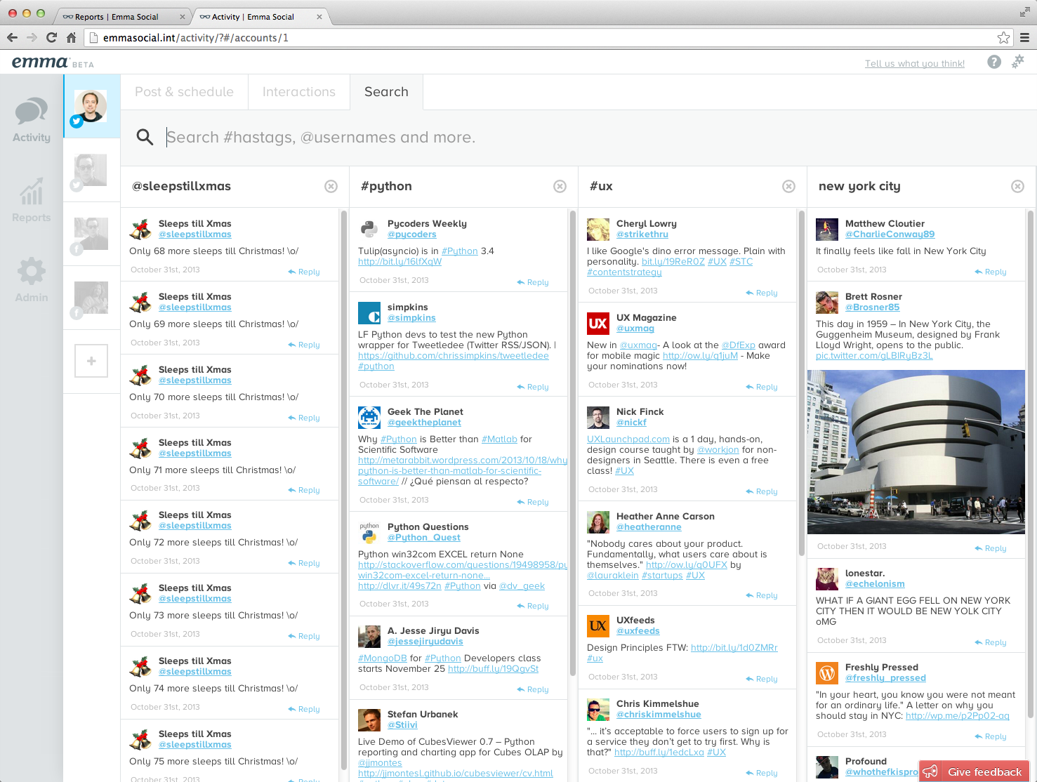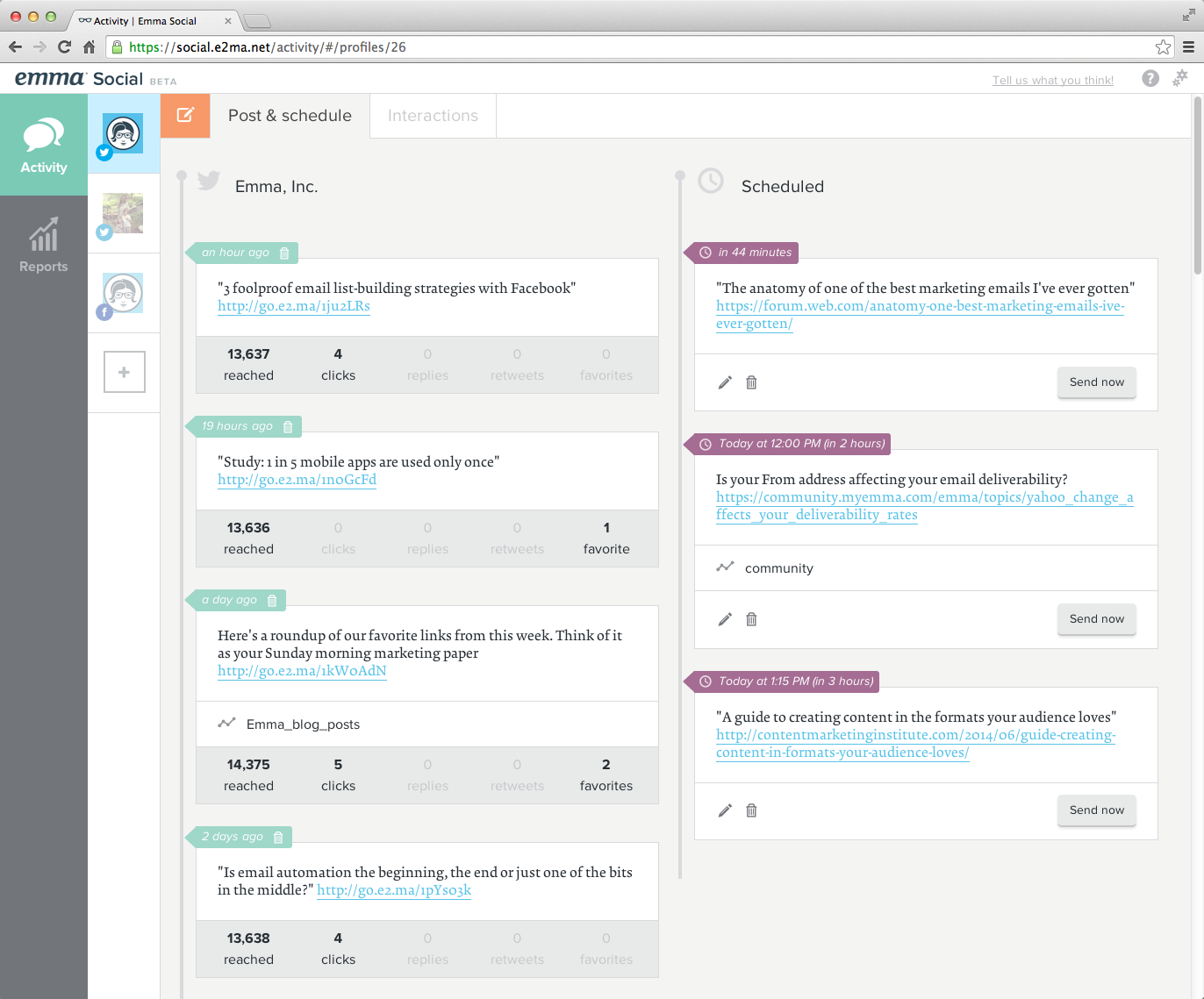 Emma Social was designed to give social media marketers a single platform to manage multiple social accounts. This included tools to create, schedule, and reply to content as well as analyze engagement metrics.
